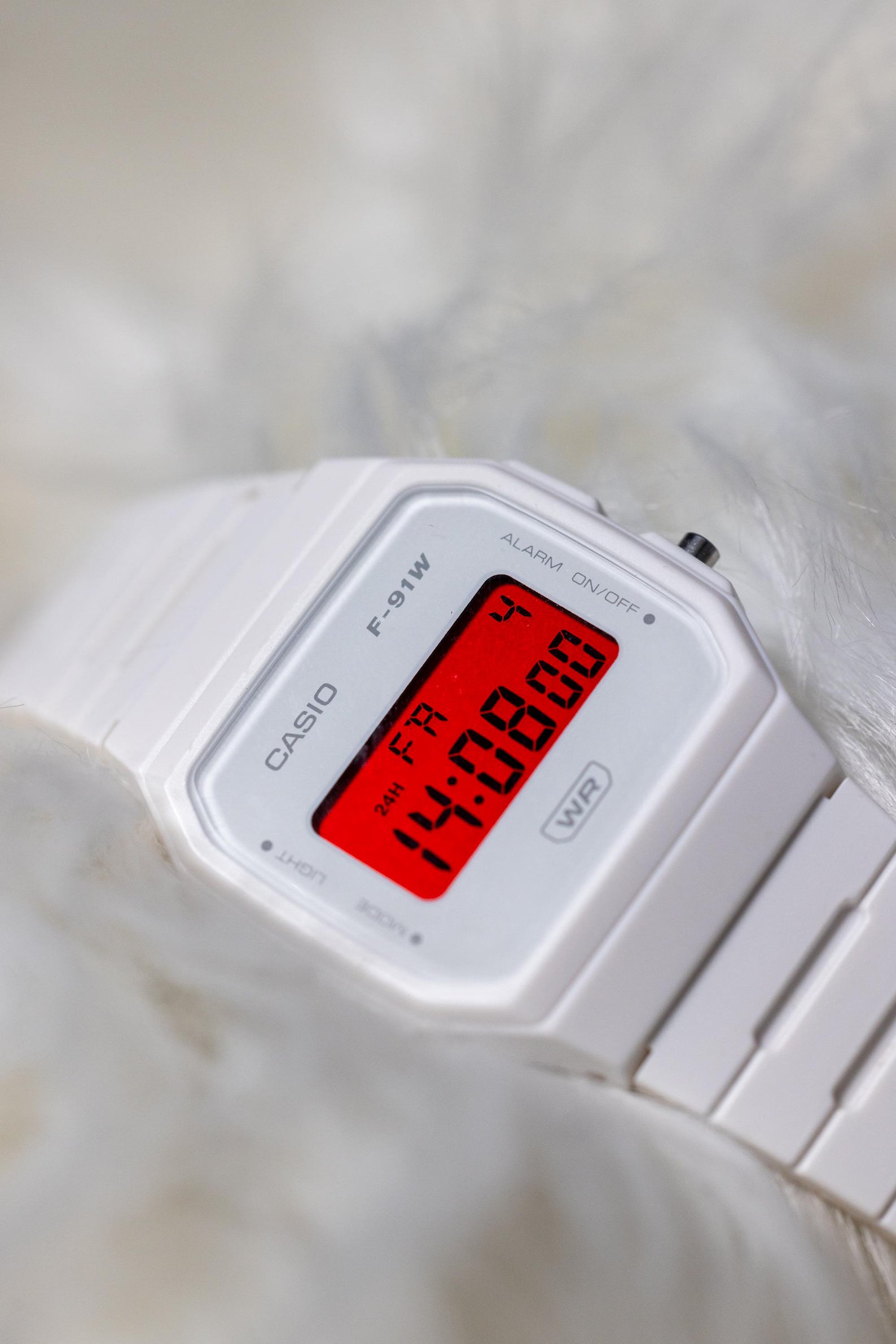 EON “Arctic Blaze” – Custom Casio F-91W Mod – White Digital Watch with Red Polarized Display – Minimalist Custom Casio Mod F91