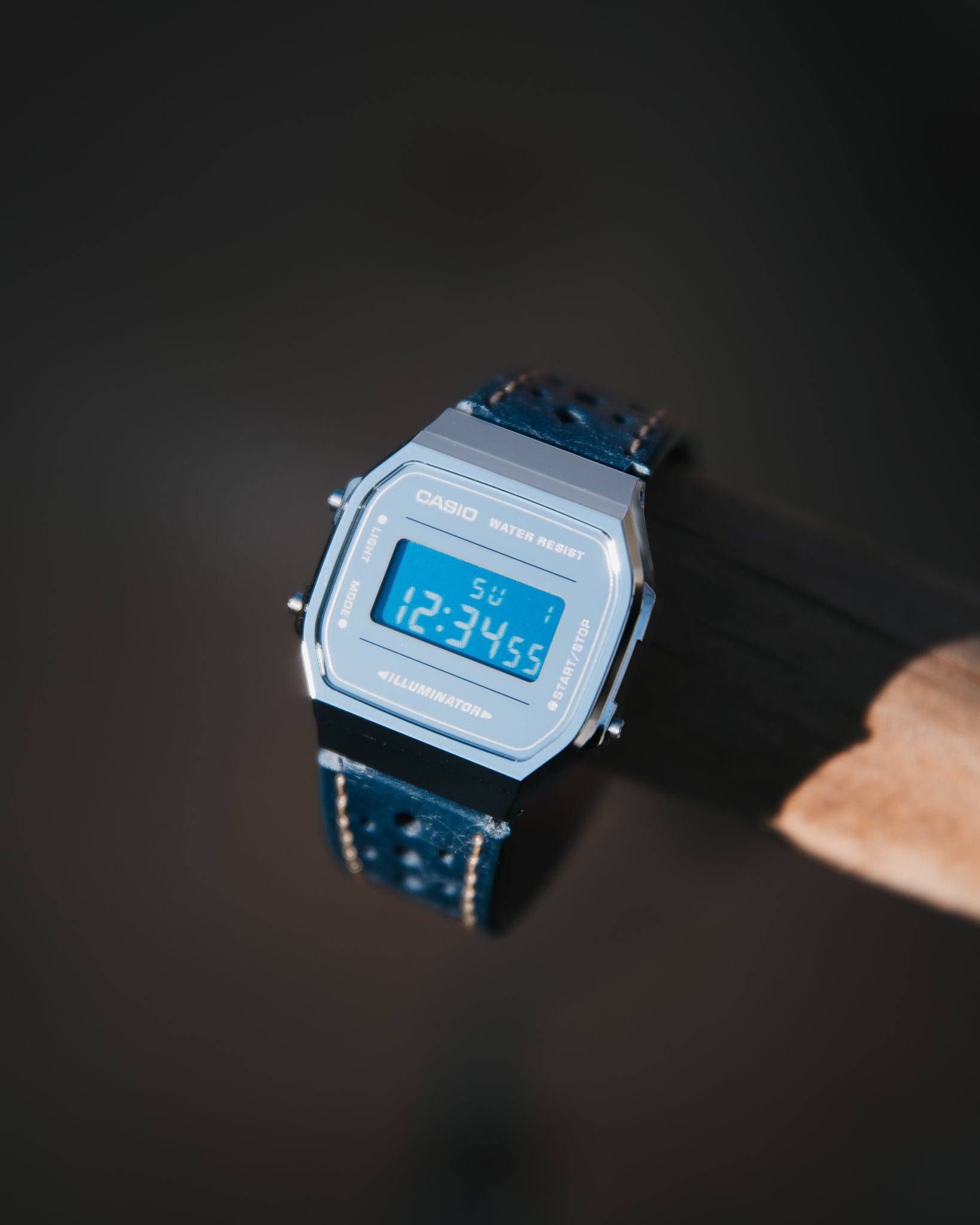 Why not combine the iconic silver A168 design with a deep blue leather racing strap and our signature negative blue display? The result is a watch that feels both refined and nostalgic.