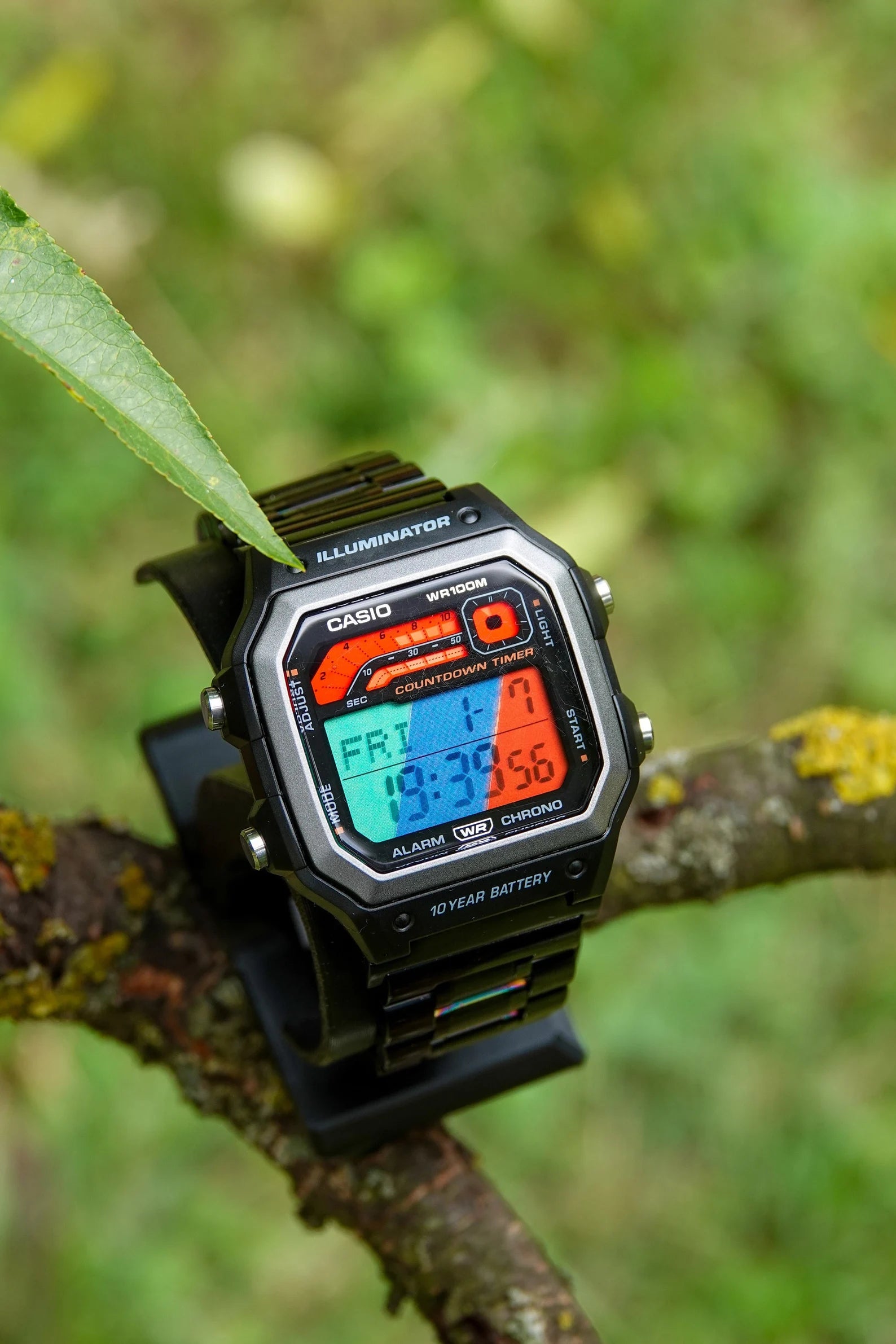 This is a fully blacked Casio WS1600, aka New Royale. Everything on this watch just clicked and made it right. The watch is fitted with 18-22mm strap adapters to be able to carry the new bracelet. This bracelet is heavy high quality black metal and has little weights in each link to give a premium feel on hand. Screen is changed to three colors of the BMW's M Power division and the upper screen has red polarization (as the redline). Also, we filled it with high grade mineral oil that improves contrast and increases water resistance to over 200 meters. Inspired by 1990s sports design, the face features two bars and a circle at the top that display three different timers — the 1/20 second stopwatch in a color bar above, the ten-second stopwatch in the bar below, and the one-minute stopwatch in a circular display at the right.Watch is modified in-house by EON workshop.