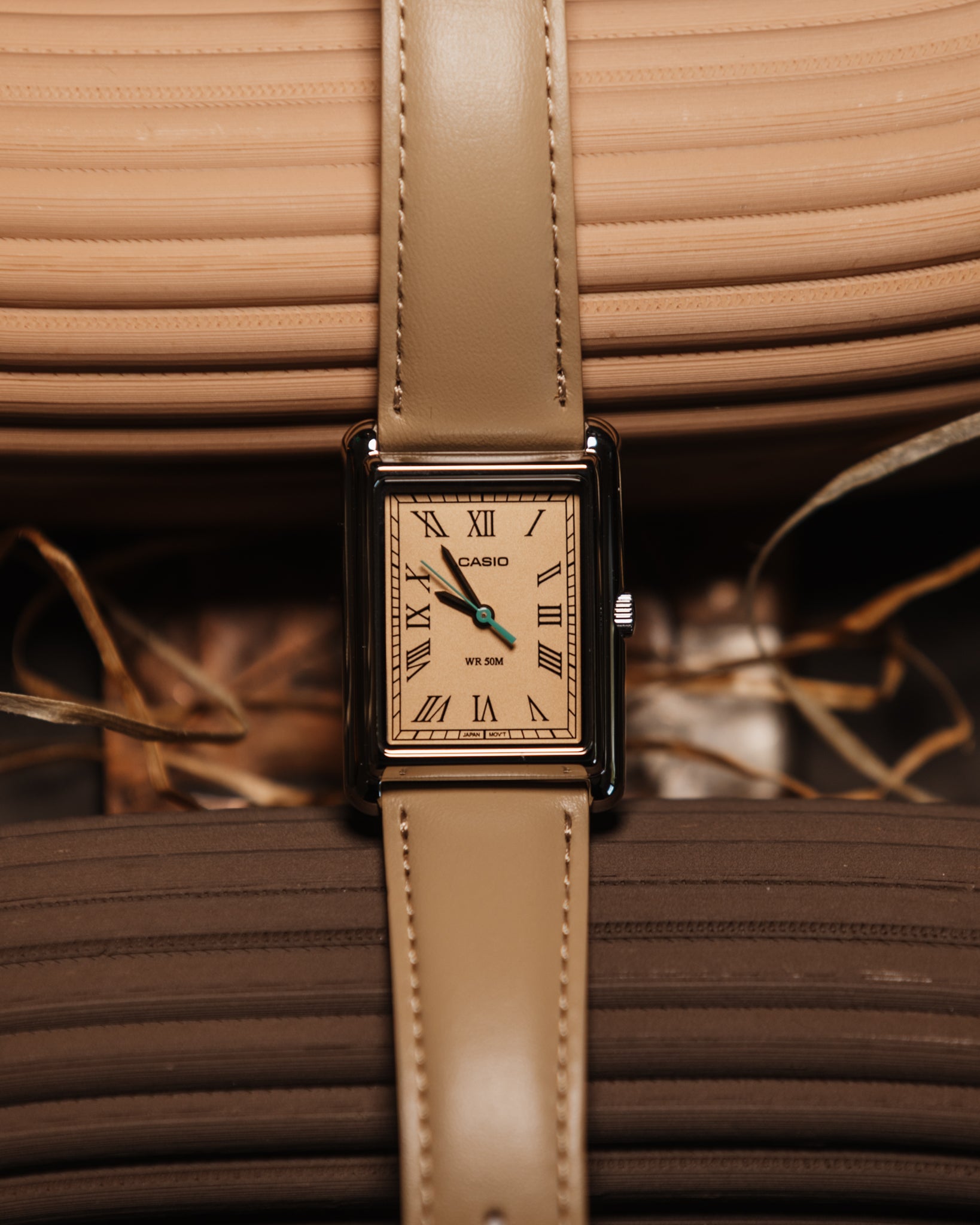 Classic, one-glance Roman numeral indexes accent the beautifully simple watch face for a design that plainly features the time of day.