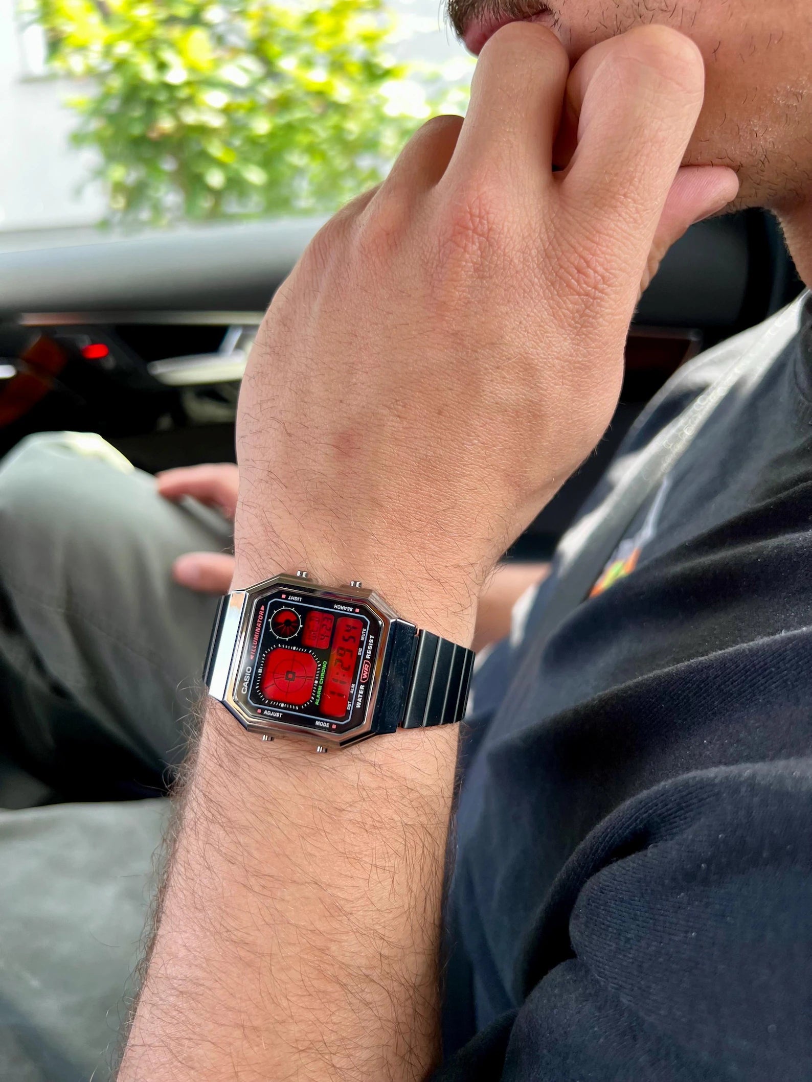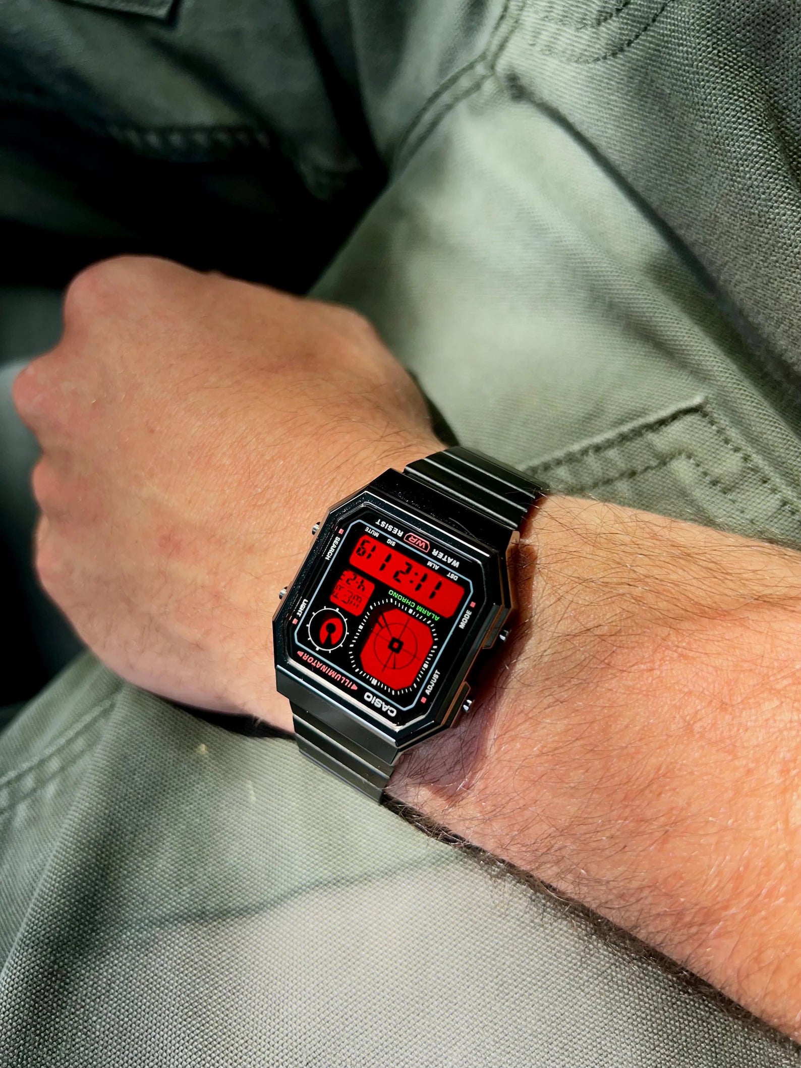 This modified piece pairs vintage structure with bold new visuals. We started with an official Casio A130, then rebuilt its display using a custom deep red screen mod. The red display amplifies both the analog-style dial and digital time functions, giving this watch a unique glow and serious personality.