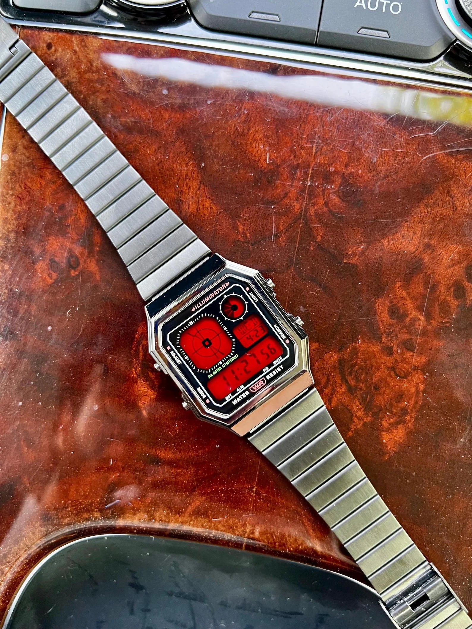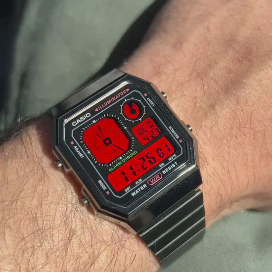 EON “Crimson Circuit” Mod – Modified Casio A130 Digital Watch with Deep Red Screen Analog-Digital Display Custom Retro Red Casio Mod ae1200
