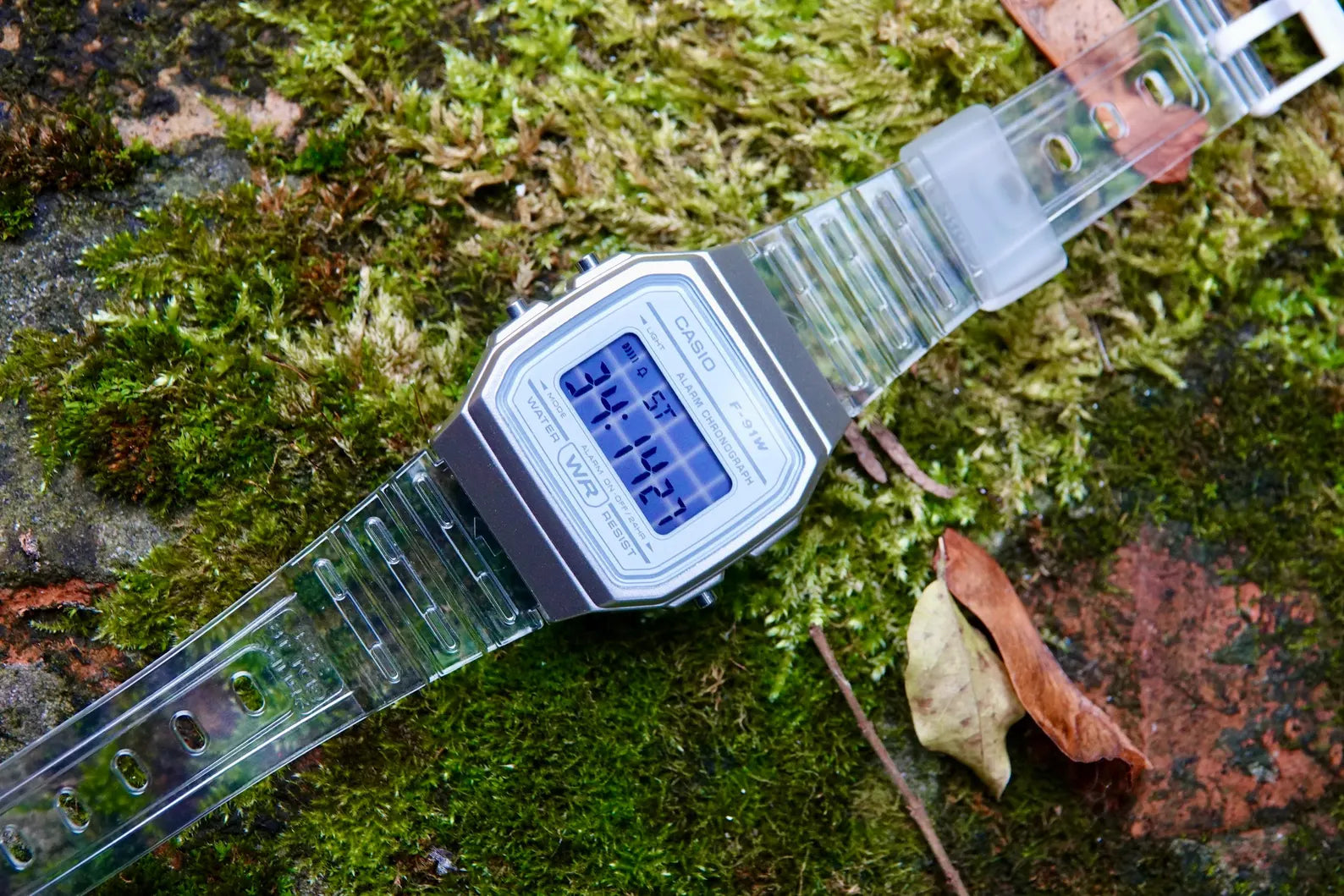 EON “Gridlines Clear” – F-91W Custom Casio Mod – Transparent Digital Watch with Violet Grid Display – Minimalist Retro Digital Gift F91