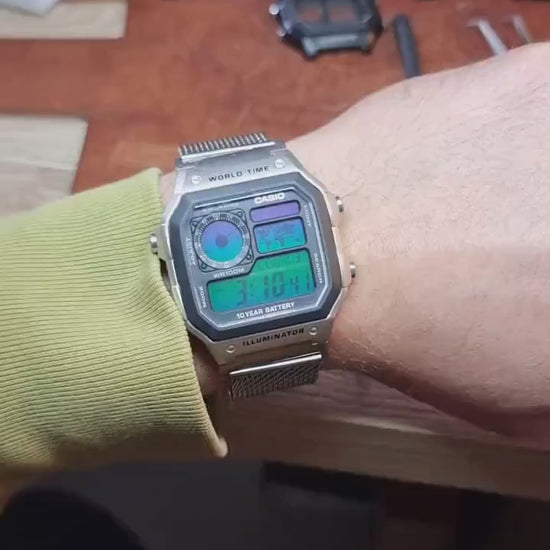 EON “King Mesh” AE-1200 Mod – Modified Casio Royale with Green–Purple Gradient Display – 22mm Metal Mesh Strap Custom Casio Hydro Mod ae1200