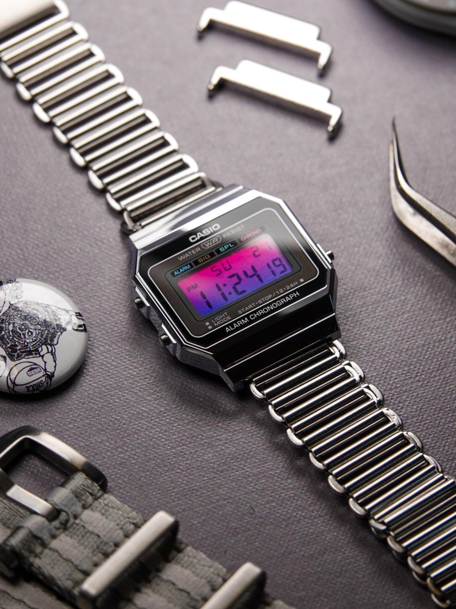 Imagine you’re on the streets of a hot Miami night in the ’80s. If that feeling could be captured in a watch, this would be it. The display resembles the neon lights of Miami with its bold blue, pink, and purple glow. The ladder-like stainless steel chain strap makes it a robust everyday carry. Think palm trees swaying under the neon skyline, fast cars cruising Ocean Drive, and the pulse of nightlife. It feels like summer, sunset, neon and all that wrapped into one timepiece.
