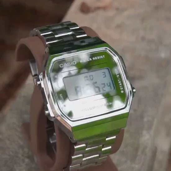 Modified Casio A168 “Mirror Chameleon” – Custom Digital Watch with Color-Shift Screen, Mirror Faceplate & Weighted Metal Bracelet Mod