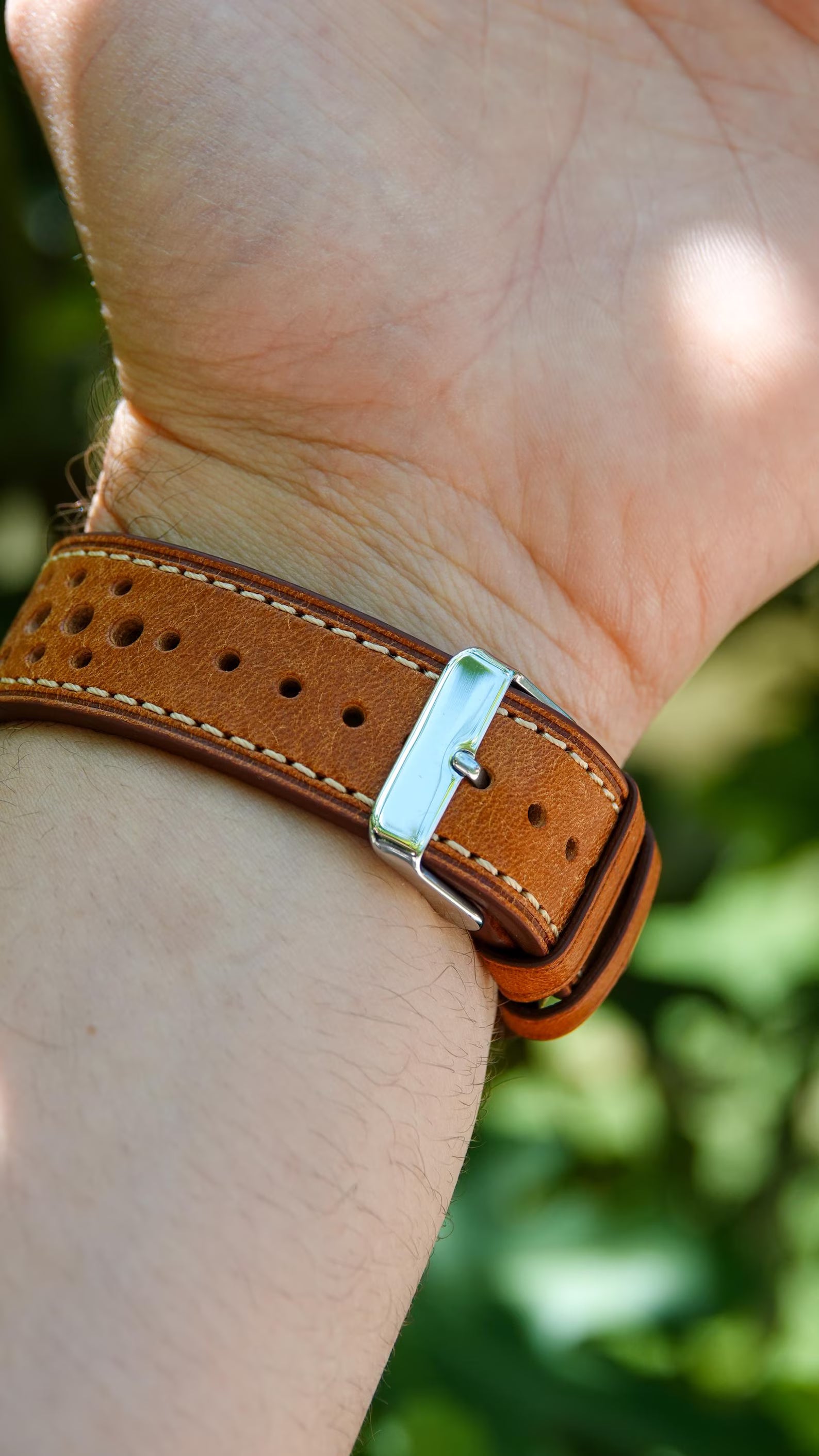Strap is racing style 22 millimeter, slotted to 18 mm lug width. By leaving the width 22mm, strap perfectly matches the 22mm body endings of the watch.
