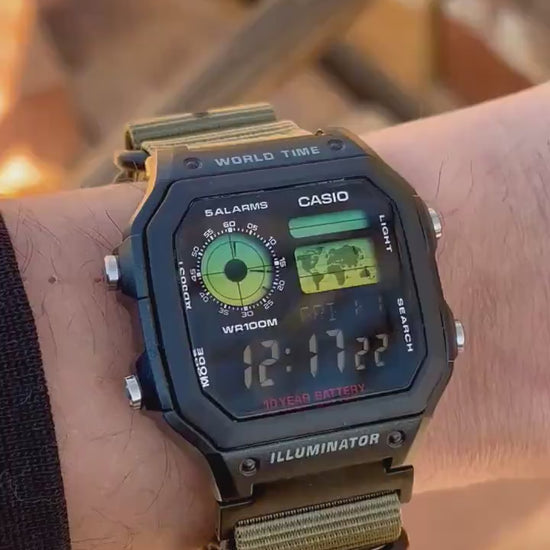 Casio “Forest Green 22mm” Mod – AE-1200 Custom Casio Digital Watch with Green Dual-Tone Screen + Military Nylon Strap – Tactical Retro Watch