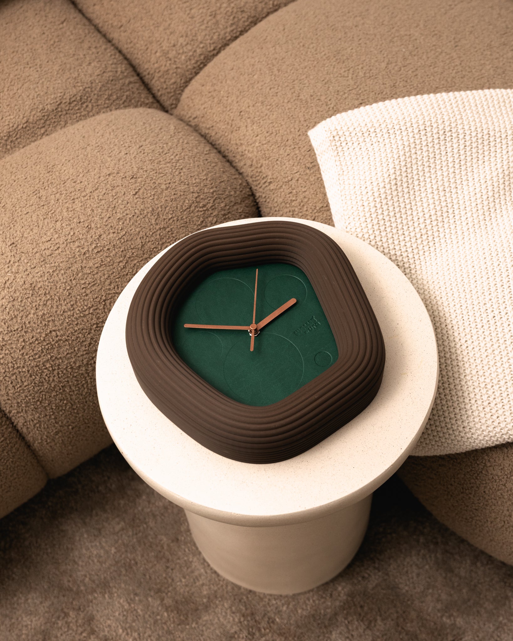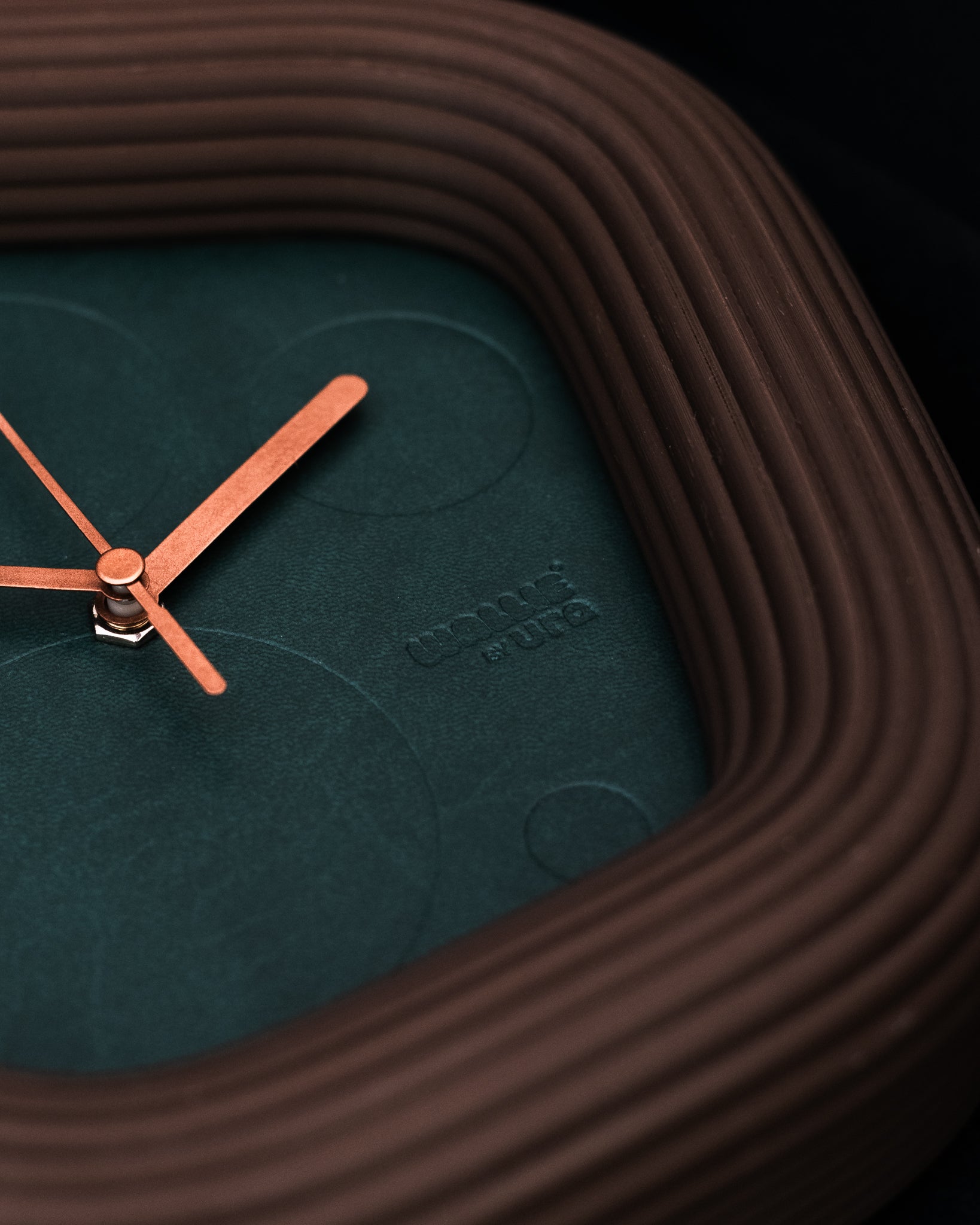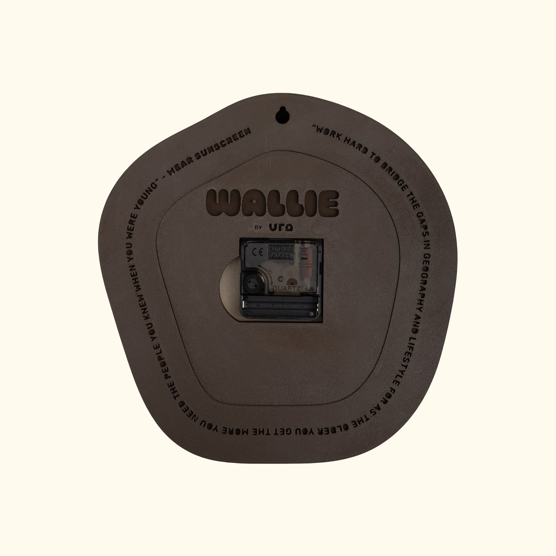 Wallie clock was born with one idea in mind - to show that clock doesn't have to be typical, round and boring. The idea was to make a beautiful shape that catches the eye, yet remains asymmetrical as all things in nature. It was co-designed with our dear friend and designer Ian Farkaš here in Croatia. Ian is a graphic designer and typography specialist with many awarded and acclaimed projects in his field. We have worked on this clock for more than a year, carefully crafting each design element to bring softness to any space. Each clock is 3D-printed in our Croatian studio using recyclable matte PLA, minimizing waste and utilizing matte look to avoid light refraction. Dial is custom made from imitation leather and it is manually thermally pressed to create ridged design. Clock hands are hand painted according to color theme. As for mechanism, Wallie uses premium, sweeping hands movement providing beautiful uninterrupted movement of seconds hand in complete silence.