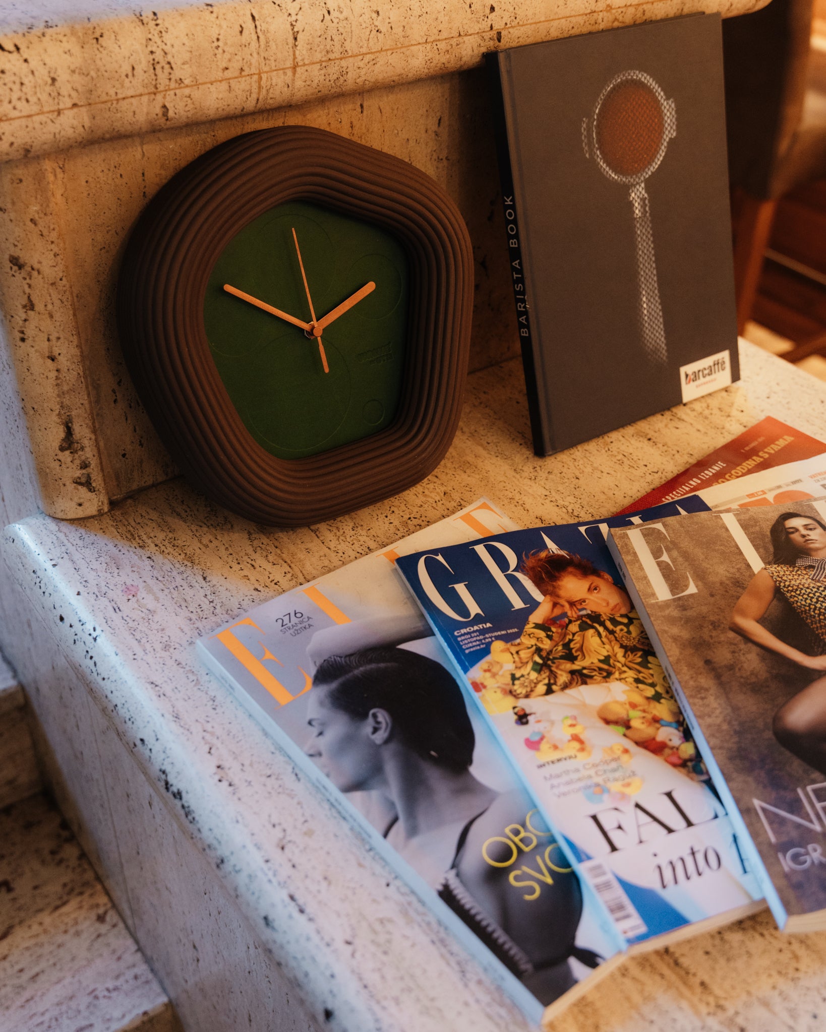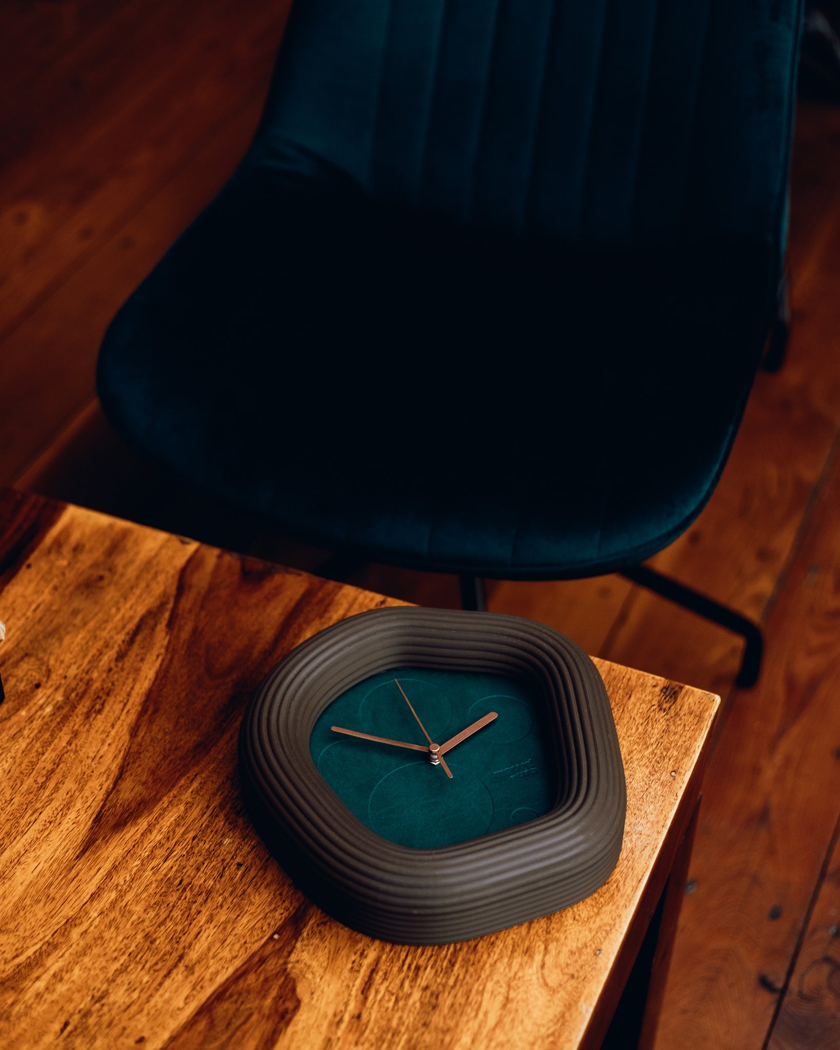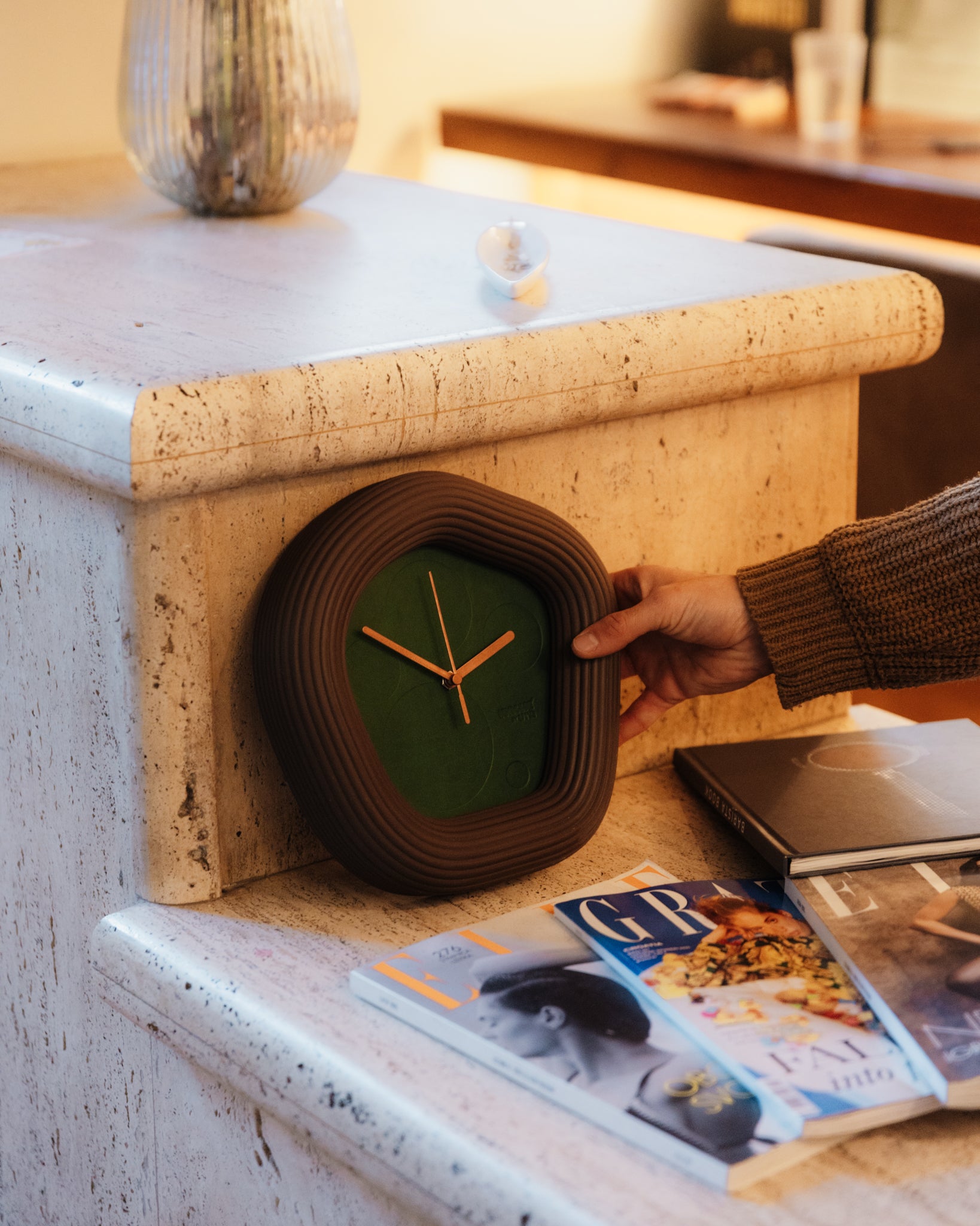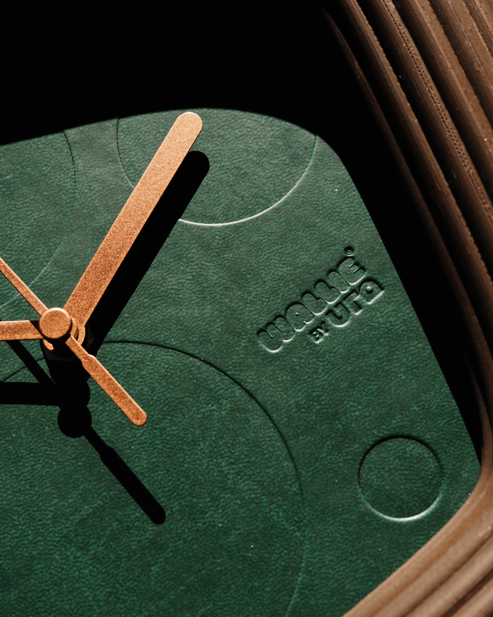 Wallie clock was born with one idea in mind - to show that clock doesn't have to be typical, round and boring. The idea was to make a beautiful shape that catches the eye, yet remains asymmetrical as all things in nature. It was co-designed with our dear friend and designer Ian Farkaš here in Croatia. Ian is a graphic designer and typography specialist with many awarded and acclaimed projects in his field. We have worked on this clock for more than a year, carefully crafting each design element to bring softness to any space. Each clock is 3D-printed in our Croatian studio using recyclable matte PLA, minimizing waste and utilizing matte look to avoid light refraction. Dial is custom made from imitation leather and it is manually thermally pressed to create ridged design. Clock hands are hand painted according to color theme. As for mechanism, Wallie uses premium, sweeping hands movement providing beautiful uninterrupted movement of seconds hand in complete silence.