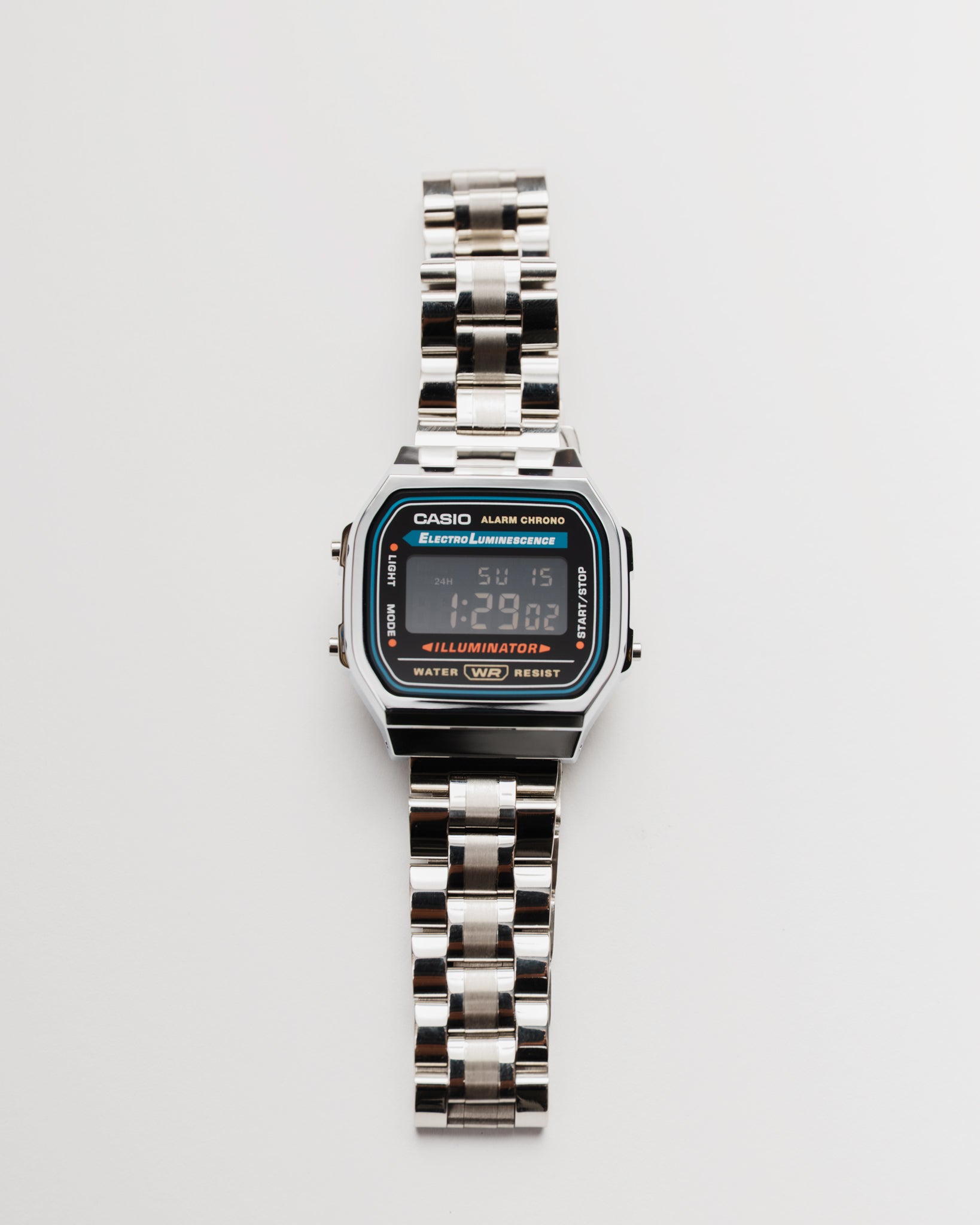 Modified Casio A168 “Weighted Metal” – Custom Vintage Digital Watch with Inverted Screen, Stainless Steel Bracelet & 200m Hydromod Option